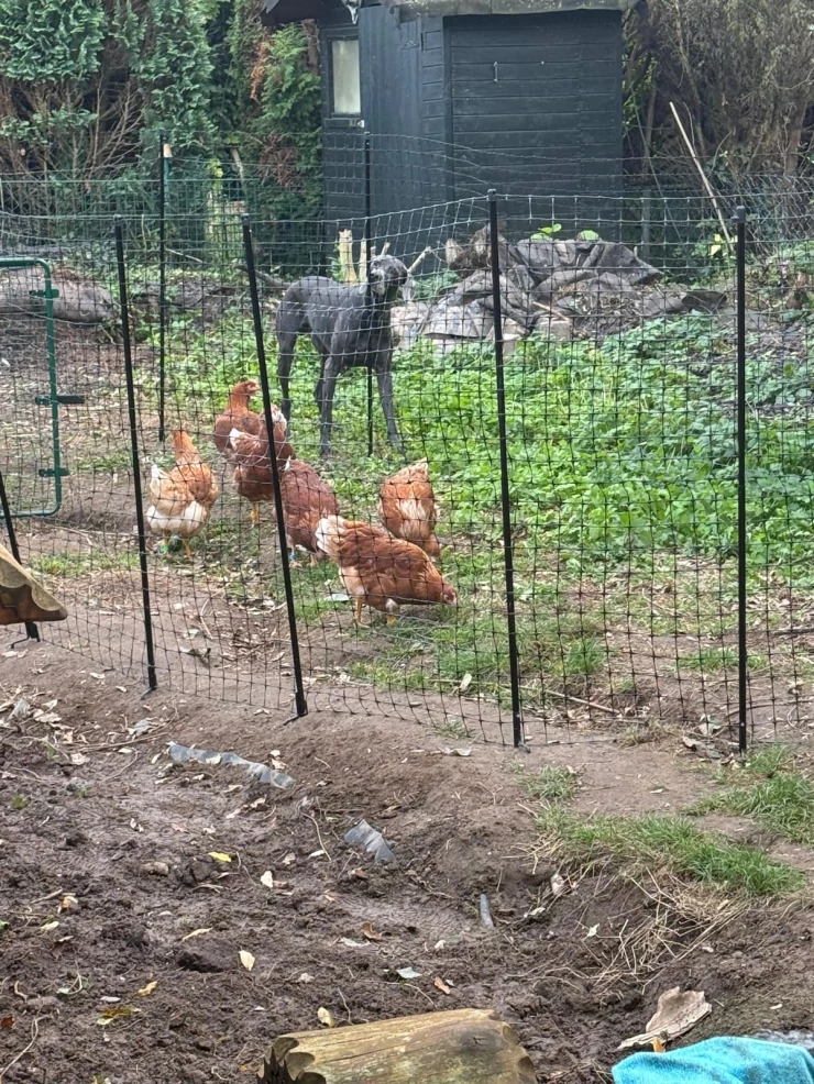 Caption: The girls, now enjoying their third chicken run extension! (slowly taking over, haha)