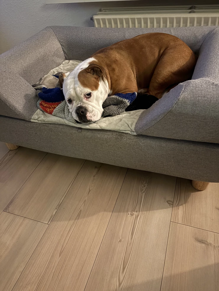 Caption: Bella loves her bed and doesn't want to leave it🥰