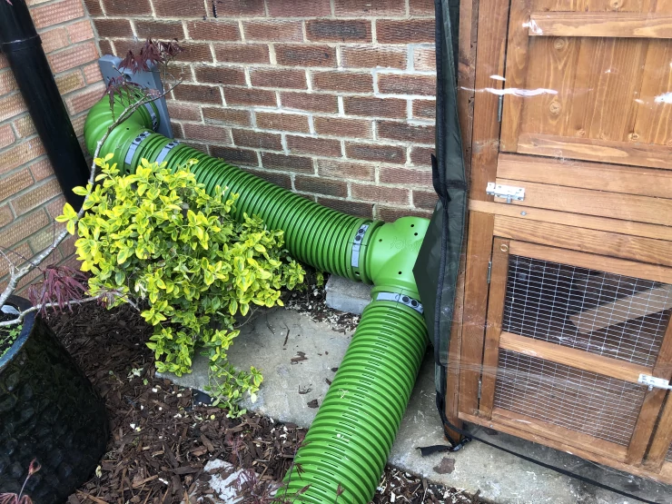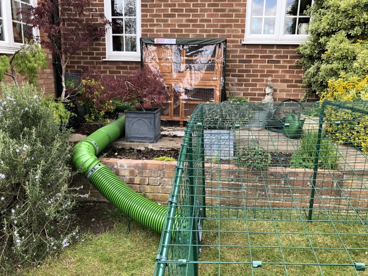 Caption: We used a door to connect to both cat flap and hutch then added to t section to Go down to a run on the grass