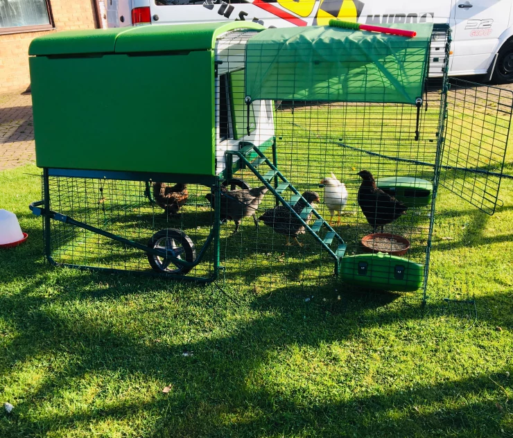 Caption: The walk in run covers offer your chickens cool shade on hot days.