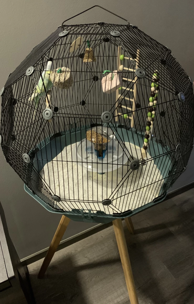 Caption: Received my Geo birdcage! so beautiful! it was easy to setup and very innovative. my guest will be very fascinated with the cage! it is so much more spacious for my budgies! ????????????????