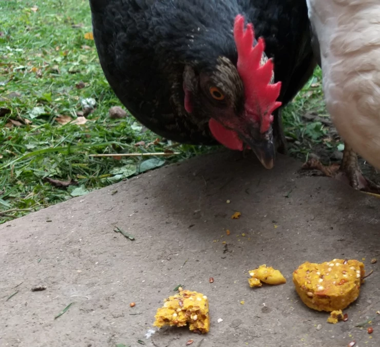 Caption: Chickens love biscuits!