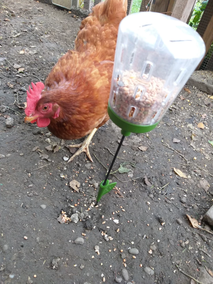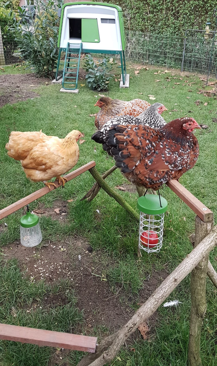 Caption: Chickens perching with Omlet Caddi treat holder and peck toys with green Eglu Cube large chicken coop in background