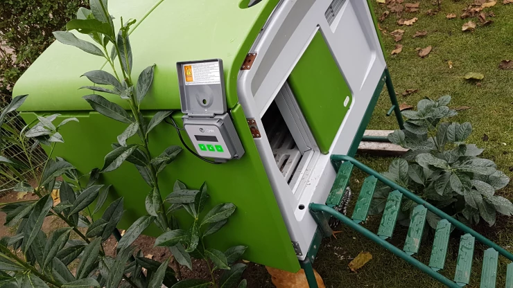 Caption: Omlet green Eglu Cube large chicken coop with Omlet automatic chicken coop door