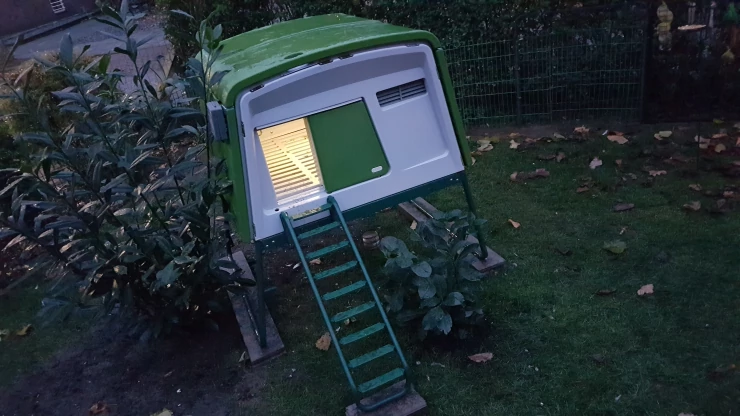 Caption: Omlet green Eglu Cube large chicken coop with coop light on