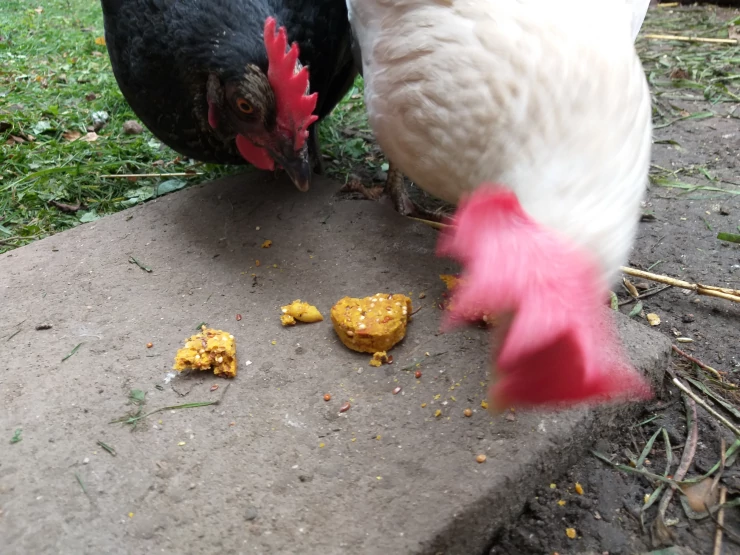 Caption: Chickens pecking at biscuit