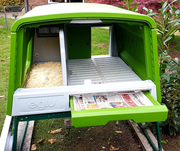 Caption: Omlet green Eglu Cube large chicken coop with droppings tray pulled out