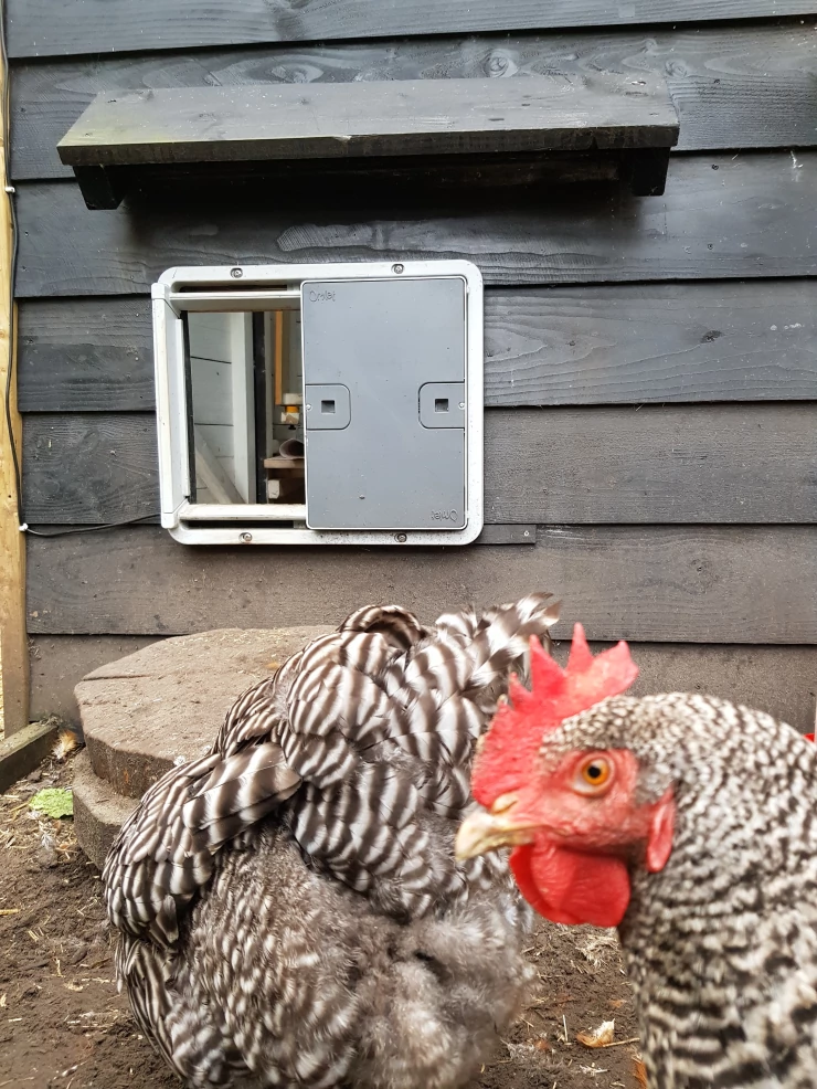 Caption: Omlet grey automatic chicken door attached to wooden chicken coop with chickens outside
