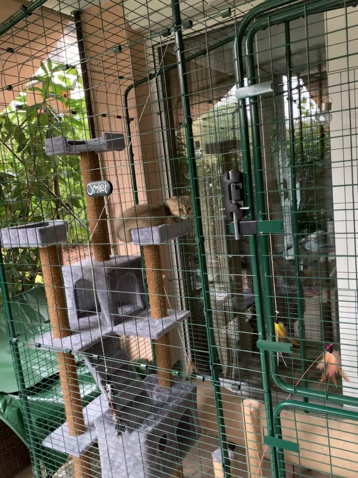 Caption: Omlet catio with cat tree and cat in it