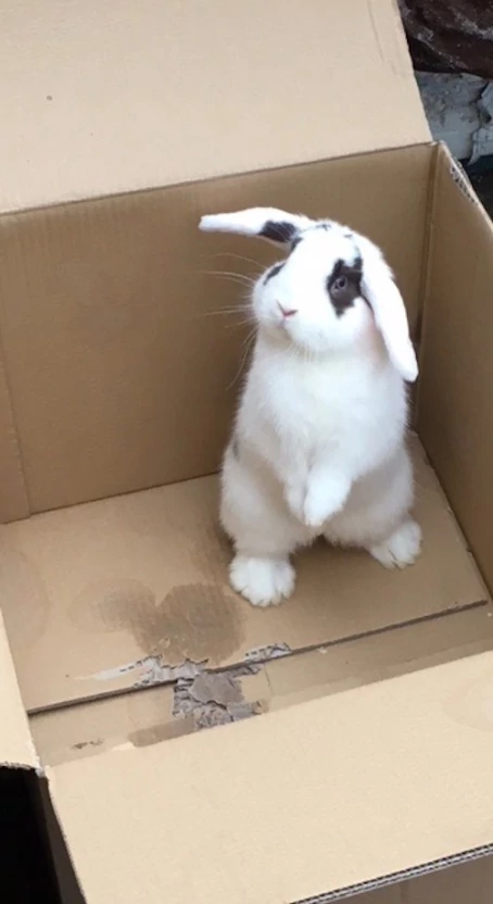 Caption: Mini Lop my Little Eddie exploring (eating) an empty box