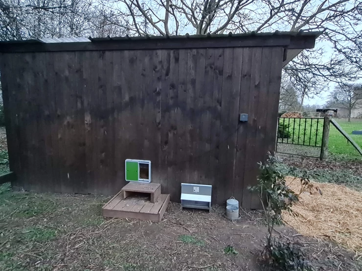 Caption: Door Omlet installed on a large wooden hen house. within 15 minutes, my hens were safe and i was relieved not to have to open and close the door.